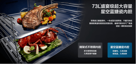 此外,老板【大搪系列】蒸烤炸一体机采用星空蓝搪瓷内胆,一体成型焊接工艺,不藏污纳垢,兼具耐高温和易清洁双重优势,500℃高温之下也不变色,轻轻一擦即可洁净焕新。