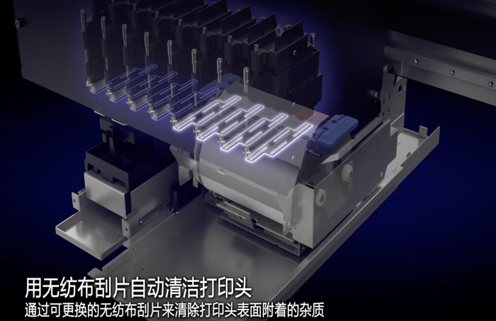 至于“高稳定” ,ML-8000拥有爱普生独具创新的“设备稳定保障体系” ,从喷嘴到介质多维防护,以低故障率告别宕机风险。ML-8000应用NVT技术 ,通过电压信号反馈实时监控每个喷嘴的状态,一旦发现堵头现象,便可通过调整临近喷嘴的喷墨方式来对故障喷嘴进行补偿,减少对品质的影响。此外ML-8000还可通过无纺布刮片来自动清洁打印头表面 ,去除沾染到的灰尘等杂质,降低堵头风险,减少日常机器维护的工作量。最后在打印介质层面,ML-8000拥有出众的自清洁体系,自带绒毛吹气系统及墨雾收集系统两个清洁体系 ,可以分别避免面料绒毛及打印墨雾附着到打印头上对打印效果造成影响。