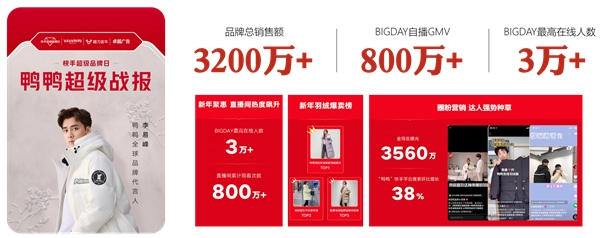 “人+内容+流量”精准匹配下,卓狐帮助鸭鸭成功打造品牌Bigday。活动当天品牌总GMV3200万+、最高在线人数3万+、直播间累计观看次数800万+,借力快手成熟的直播模式、卓狐提供的精细化整合营销策略,鸭鸭品牌热度火速蹿升,实现GMV爆发。