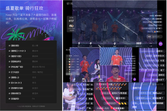 实际上,Keep动感单车课不仅仅抓住了音乐陪伴给运动带来的价值,更在音乐贯穿的基础上,全面进行了直播间的沉浸式课程升级,全网首创的直播教练组团开练模式、全新的直播间主题氛围打造,在视觉上、听觉上和认知感受上都将课程内容价值发挥到最大化,早在2020年,Keep动感单车直播课就喊出了「蹦迪式骑行派对」的概念,随后在2021年8月推出每月17日音乐主题派对的IP活动。