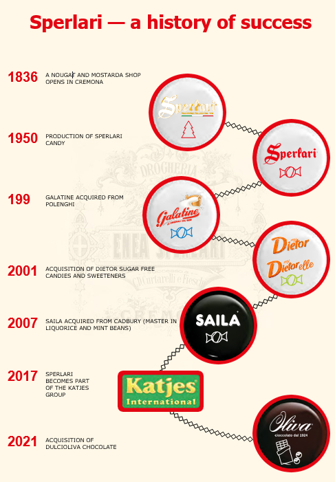 经过百年的历史沉淀,Sperlari品牌闻名世界。但位于索费里诺街(Via Solferino)历史悠久的小商店如今仍在营业,像180多年前一样向许多意大利家庭出售糖果。如今,它已经成为当地民俗文化的一部分。Sperlari的历史专注于与其他主要品牌共同发展,这些品牌都是其类别里的创始者。所有属于Sperlari家族的品牌都是同类产品的开拓者。