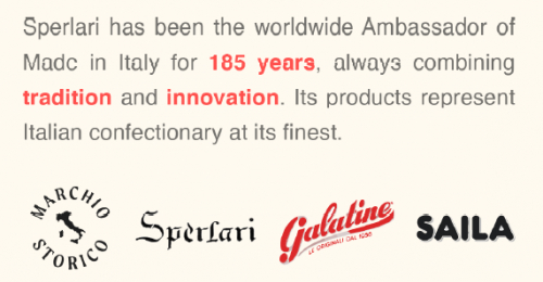 Sperlari、SAILA和Galatine佳乐锭均符合以上所有特点,Sperlari的历史品牌伴随了4代意大利人,所有的生产基地都在意大利境内:Cremona, Gordona (克雷莫纳,戈尔多纳), San Pietro in Casale (卡萨尔的圣彼得)和Silvi Marina (锡尔维玛丽娜)。此外,产品均使用了来自意大利的原料。首席执行官说:“我们所有品牌的产品都是在意大利的四家工厂生产,并大量使用来自意大利的原料,比如Sperlari用的水果、Galatine使用的牛奶和SAILA的薄荷和甘草。”