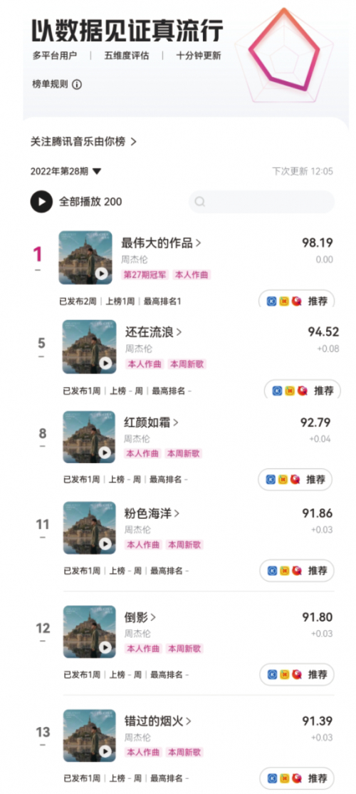 7月14日,周杰伦最新专辑《最伟大的作品》惊喜上线,推出后立刻引起各大社交平台讨论和关注。腾讯音乐由你榜榜单显示(数据截止到7月15日中午12点),新发布的5首新歌一经上线就迅速占领榜单前列,而《最伟大的作品》同名歌曲以98.20的新歌综合得分成为夺冠歌曲。