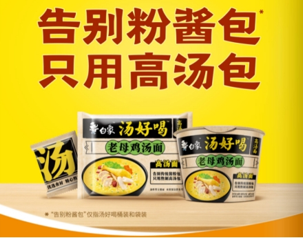 2018年,白象食品依托20多年积累的熬汤经验,并先后走遍中国26座城市收集百余款汤面配方,以及向烹饪协会国家级烹饪大师、各地方名厨、台湾名厨请教,其行业首创的高汤面产品——“汤好喝”方便面上市。“告别粉酱包,只用高汤包”的衡量新标准也一举打破“以调味料调味”的边界,打开了“以汤调味”的新格局。