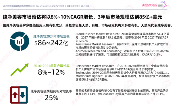 纯净美妆又称“Clean Beauty”,起源于欧美,这一概念最早是由美国好莱坞女性格温妮丝提出,她倡导美妆产品配方透明,不含对人体有毒或者疑似有毒的成分,追求安全、无毒,纯净美妆在欧美被广泛的推崇。据美业颜究院《2021纯净美容趋势分析及预测》报告收录的数据显示,2020年全球纯净美妆市场为54.4亿美元,到2027年预计将达到115.6亿美元。