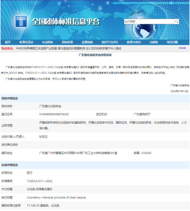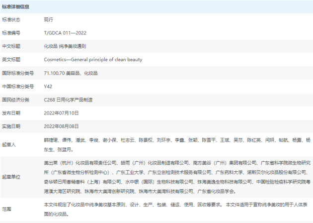 7月10日,广东省化妆品学会在全国团体标准信息平台正式发布了《化妆品纯净美妆通则》(T/GDCA011-2022),实施日期为2022年8月8日,是国内化妆品行业首份针对纯净美妆制订的标准文件。