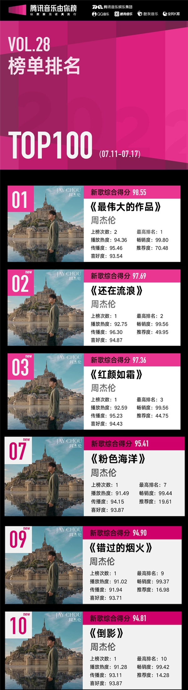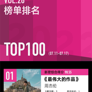 7月18日,腾讯音乐由你榜发布2022年第28期榜单,周杰伦本期仍旧取得好成绩,新专辑中的6首歌曲均进入TOP10,且《最伟大的作品》《还在流浪》《红颜如霜》包揽榜单前三名。与周杰伦同期上榜的还有“榜单劳模”周深,所演唱的电视剧OST《追赶春天的人》表现出色位于第四。刘雨昕《Boom Tick Boom》、单依纯《靓仔日记》、希林娜依·高《瑕面舞会》以及INTO1《天生就要飞》等新生代歌手成绩强势攀升。由周杰伦引领华语音乐热门潮流,新锐艺人探索华语音乐别样风格,本期的腾讯音乐由你榜展现出华语乐坛的精彩盛况。