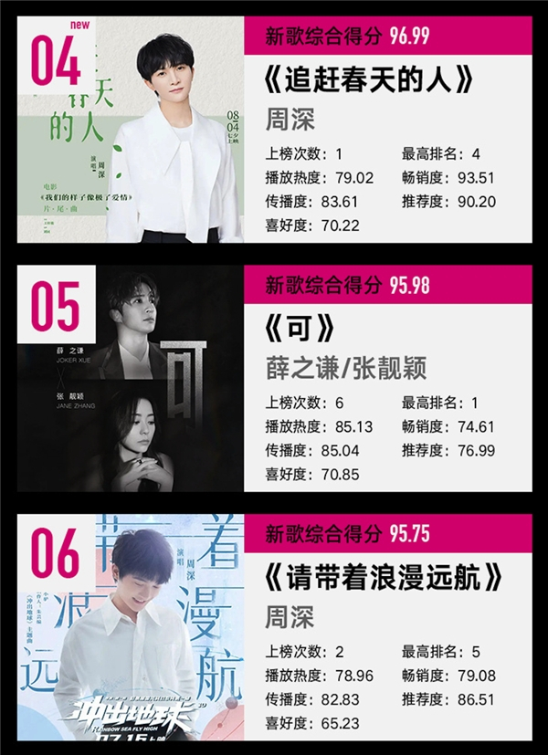 在周杰伦霸榜期间仍然以两首优秀作品上榜前十的周深,成为本期榜单最大的亮点。凭借实力唱功和高人气成为了华语乐坛OST大户的周深,空灵唯美,细腻声线唱出《追赶春天的人》(《我们的样子像极了爱情》片尾曲)的自由与浪漫。另一首《请带着浪漫远航》(《冲出地球》电影主题曲)笃定梦想的姿态引发听众共鸣。还有连续上榜5周,拿下四连冠的歌曲《可》,依旧实力不凡,薛之谦与张靓颖的梦幻联动,深情演绎让粉丝百听不厌,本周仍在榜单第五。