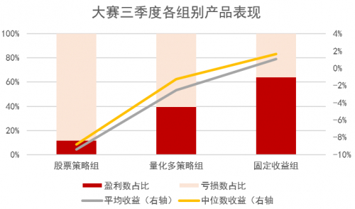 固定收益组在大赛三季度表现持续优秀,64.08%的参赛产品取得正收益,平均收益达1.11%,中位数收益1.67%。