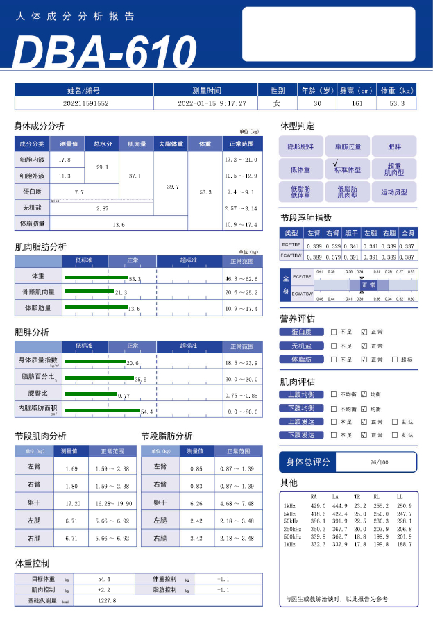 东华原人体成分分析仪(DBA-610)应用8点接触式4电极生物电阻抗测量方法(BIA),通过1,5,50,250,500,1000kHz的测量频率,对成人和儿童群体进行多成分测量,覆盖总水分、细胞内液、细胞外液、蛋白质、无机盐、体脂肪量、肌肉量、去脂体重、节段脂肪、浮肿指数、相位角、身体围度等几十项指标。测量时间约为1分钟,自动存储测量数据,可接入医疗机构HIS、PACS、LIS、RIS等信息化平台,便于操作、管理和使用。