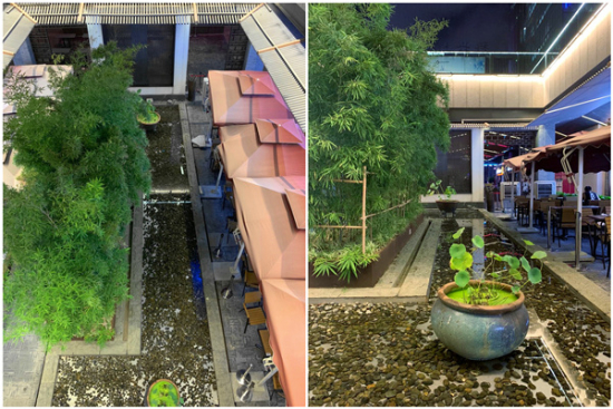 原味街采取的是下沉式广场的建筑构造,园区的四角和中心为扶手电梯,连接着美食广场和平台花园两块区域,集休闲和美观于一体。街区中庭自然采光,以竹林、水系,再加以古风式屏障为点缀,让宾客仿佛置身于清泉流水的山林之中。
