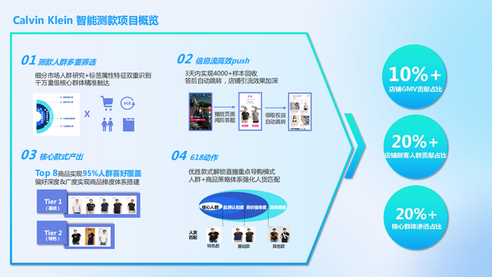 Calvin Klein则是通过“智能测款”,在618大促前,在众多货品中精准选出了“潜力爆品”,让货品上新的售罄率大大提升,数据显示,Calvin Klein TOP 8商品可以覆盖95%人群喜好,与此同时,“智能测款”筛选出的优胜款式还解锁了“直播重点导购”模式,让“人货匹配”落实得更充分。