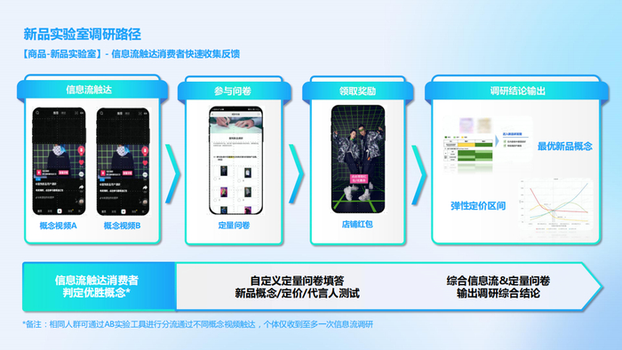 在新品孵化阶段,价格、概念、功能、卖点等信息都需要前置确定下来。但,如何决策是个棘手问题。有了“新品实验室”,品牌就可以使用其“定向问卷”功能,设置问卷,通过信息流高效触达目标消费者,快速收集数据得出调研结论,让决策周期更短、准确度更高。