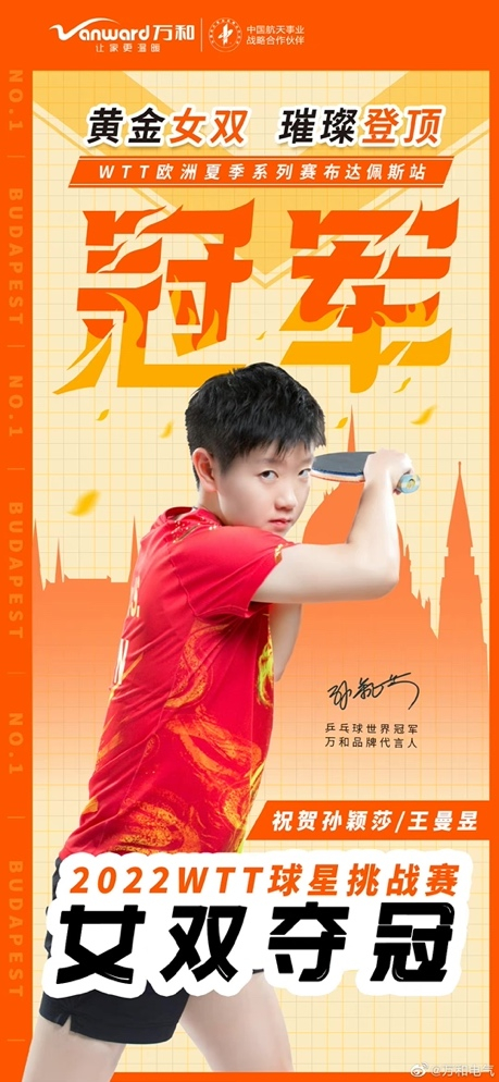 祝贺!厨卫电器专家万和电气代言人孙颖莎与队友王曼昱WTT球星挑战赛女双夺冠