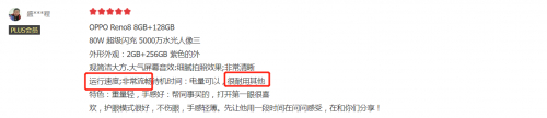 在诸多用户评价中,很多用户都提及了OPPO RENO8的续航和充电。要知道 RENO8是全系标配了4500mAh电池和长寿版80W超级闪充,续航表现和充电速度都是很容易满足日常使用需求的。对此很多用户也给出“超长待机,电量持久”、“待机时间长”、“闪充真是特别快,充完电后一直玩手机也能玩一天多”等评价,很好的解决低电量焦虑。