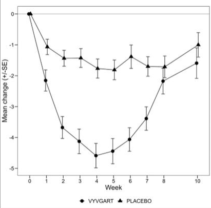 首先,是疗效突出。Efgartigimod三期临床研究主要终点是重症肌无力日常活动评分(MG-ADL)实现应答,标准为连续4周或以上至少改善2分。而结果显示,接受efgartigimod治疗4周时,超过一半患者的MG-ADL量表改善了5分或更多,远超过设定标准。最终结果显示,67.7%接受efgartigimod治疗的患者达到了主要研究终点。