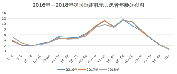 如下图所示,2016年-2018年我国重症肌无力患者年龄主要集中在30岁以后,其中以50岁—70岁的中老年人为主。这意味着,随着我国老龄化趋势加深,患病群体数量或许会进一步增长。