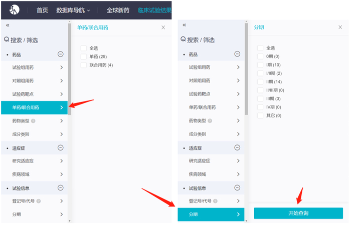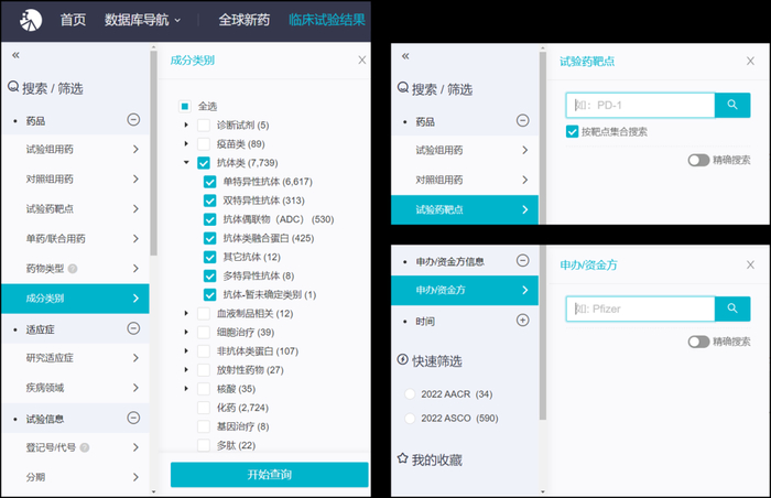 不光治疗领域和适应症,在实际工作中,可能也需要查询特定靶点、特定药品成分类别已发表的临床试验数据。基于Insight数据库的筛选项,可以定位到不同领域的试验数据。