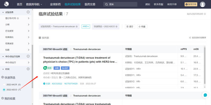 此外,Insight对国际医学会议持续关注,精选大会中公布的重要临床试验结果数据高速更新入库。通过左下角的快速筛选项,可以快速定位到2022年度重要医学会议上发布的结果。仍以Enhertu为例,Insight已经收录该药在2022 ASCO及其分会上公布的7项重要临床试验数据。