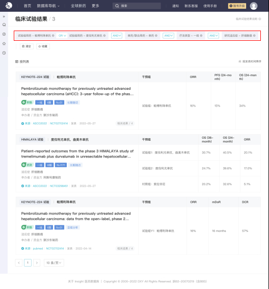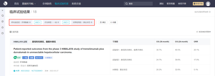 而以 2022 年第 1 版 NCCN 肝胆管癌指南中新增的肝细胞癌一线治疗方案为例,该版指南新增了度伐利尤单抗和帕博利珠单抗。分别在试验组用药筛选项检索帕博利珠单抗和度伐利尤单抗,筛选单药,可以看到KEYNOTE-224研究和HIMALAYA研究的试验结果。