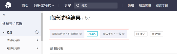 如检索研究适应症为肝细胞癌,选择疗法类型为一线,可检索得到肝细胞癌一线治疗的临床结果,共 57 条。可以看到,该功能模块收录了 NCCN 肝细胞癌一线治疗推荐方案的全部证据。