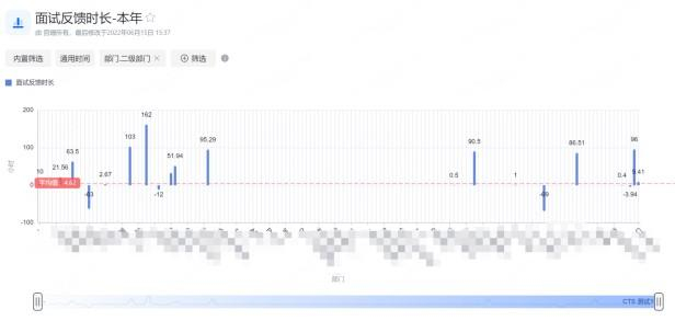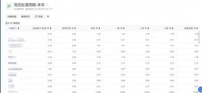 这一部分需要拆分成简历筛选、面试两个重点环节, 了解用人部门的配合程度。这类数据报表可以反映出,HR将简历推给面试官后,时隔多久面试官进行了筛选,又是多久反馈了面试结果,进而判断这个招聘需求是否真的紧急 。