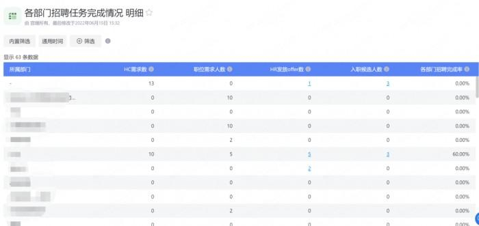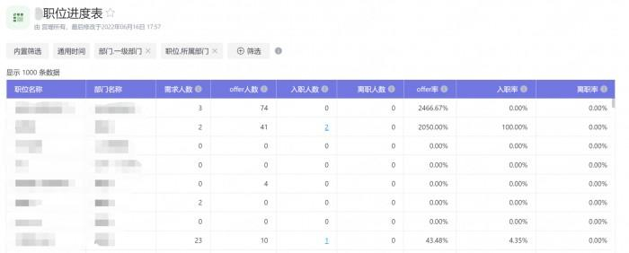 · 借助职位进展表 ,用人部门能够以职位、部门的维度去看需求人数、offer人数、入职情况、入职率等,详细了解岗位的招聘进度。