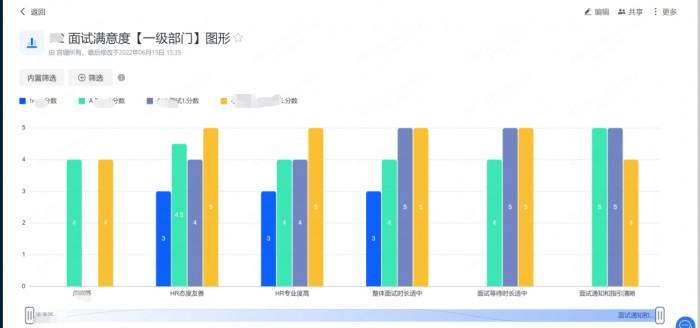 收集完候选人的意见反馈后,报表会以柱形图的形式、调查题目的维度呈现,每条竖杠就是可以是一个部门,也可以是一个面试官,条理清晰、直观全面的完成复盘。