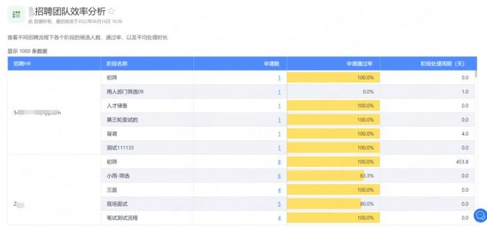 · 通过简历筛选效率表 可以看到不同时间维度下的简历处理周期,如本年、本月、本周、甚至本日。一般来说,以周维度和月维度观察数据、查看趋势,更为常见。