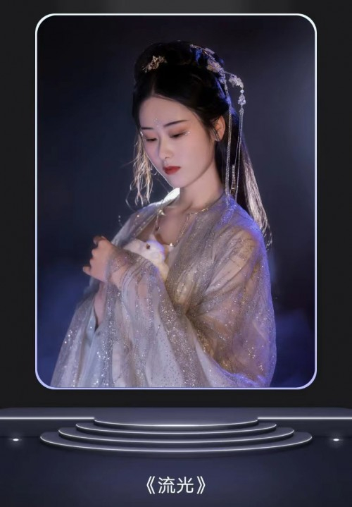 碎星亮片点缀半透大袖衫,营造出轻盈银河的流光之感,内搭为改良唐制诃子裙,典雅窈窕。