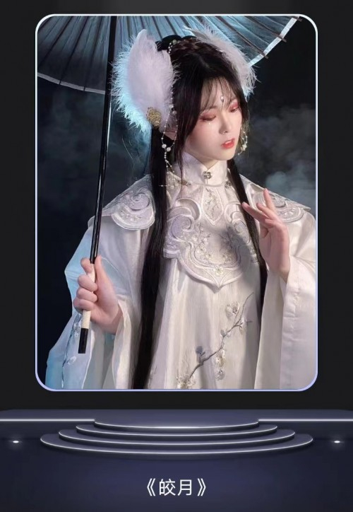 纯白色调的明制汉服与雅致云肩。云肩的搭配在不同朝代中均有使用,以明制汉服最为常见和丰富。云肩,常用四方四合云纹装饰,并多以彩锦绣制而成,晔如雨后云霞映日,晴空散彩虹,故称之谓:云肩。后经过更多的尝试,颜色上的选择性越来越多,包括云肩上的纹样。白梅刺绣在其中如同雪中绽放,清冷典雅。