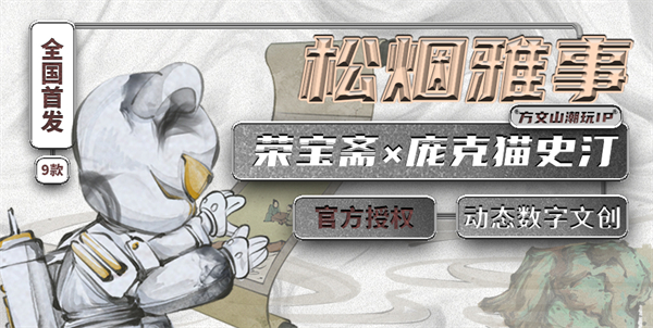 2022年7月,中国台湾著名作词人方文山先生为庆祝荣宝斋350岁生日快乐,特意创作庞克猫史汀-丹忱款于“翰墨家国——荣宝斋350周年专题展”亮相。随后由方文山跨界设计打造的庞克猫史汀潮玩IP,也即将与老字号荣宝斋联名发行限定版庞克猫史汀公仔-松烟墨色系列。为让大家先一睹为快而推出系列数字藏品,在国内外顶级IP数字平台“元琮”上限量发售。