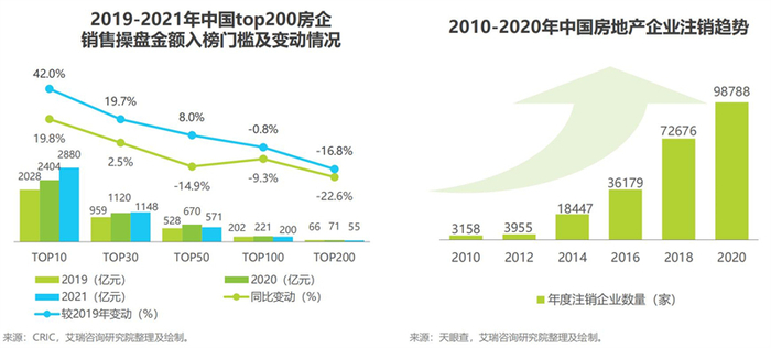 另一方面,房地产企业注销数量逐年上升,2020年中国房地产企业注销数量达98788家。中小型房企规模小、服务水平低、缺乏在资源及市场运作经验等方面的竞争力,企业“存活难”问题显著。