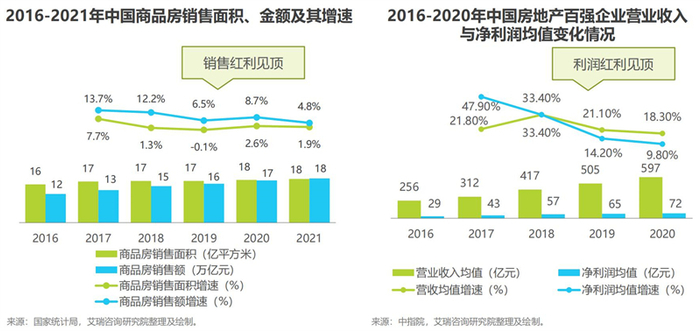 《报告》指出,2021年全国商品房销售额约18.2亿万元,同比增速由上一年的8.7%下滑至4.8%;同时,中国房地产百强企业的净利润均值增速相较2017年出现了大幅下滑。