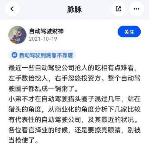 此外,也有脉脉网友直言,部分自动驾驶公司吃相难看,“左手数倍薪资挖人,右手忽悠投资方”,建议网友在择业时注意擦亮眼睛。
