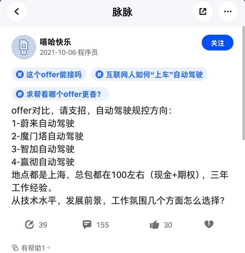 在脉脉网友发布的offer选择的帖子中,蔚来、魔门塔、智加、赢彻四家公司给到的总包(现金+期权)都在100万左右,这让不少网友留言表示“慕了”。