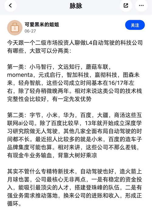 自动驾驶行业目前仍处于群雄逐鹿的发展期,多家科技巨头入局但并未形成垄断格局。按照脉脉网友的分析,自动驾驶公司大致可以分为两类。