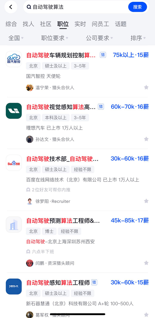 不论是哪一类公司,核心竞争力归根结底还是人才,在各大企业持续投入的情况下,自动驾驶技术岗待遇水涨船高。在脉脉招聘板块,自动驾驶算法类岗位月薪在30-50K。