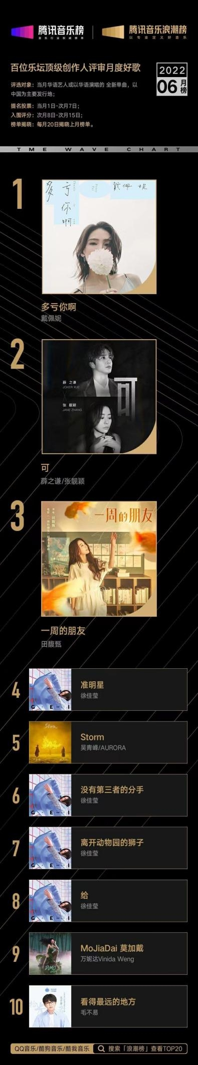 今日,腾讯音乐榜的子榜单腾讯音乐浪潮榜(以下简称:浪潮榜)发布了2022年6月榜。经过超百位专业创作人组成的评审委员会的严格评选,诸多音乐人携优质新作上榜。盘点本期榜单,戴佩妮《多亏你啊》、薛之谦/张靓颖《可》和田馥甄《一周的朋友》揽下榜单TOP3。徐佳莹携《准明星》、《没有第三者的分手》、《离开动物园的狮子》和《给》四首新歌成为本期上榜数量最多的歌手。