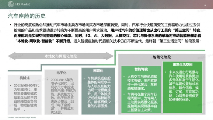 IHS Markit™️在《智能座舱市场与技术发展趋势研究》报告中,结合汽车产业的发展历程与汽车产品的演进历史,将汽车座舱的发展大致分为本地化、网联化与智能化三个阶段。