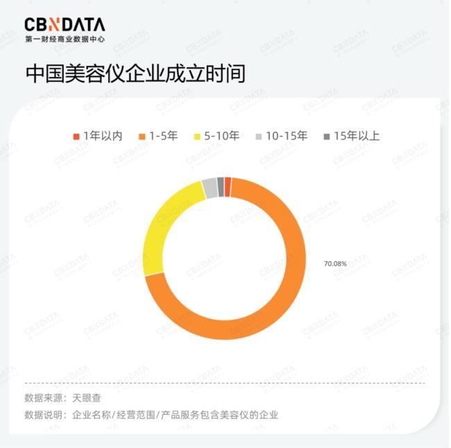 天眼查数据显示,截至2022年7月,企业名称/经营范围/产品服务包含“美容仪”的企业超过25000家,其中近18000家注册时间在1-5年内,占比超过70%。