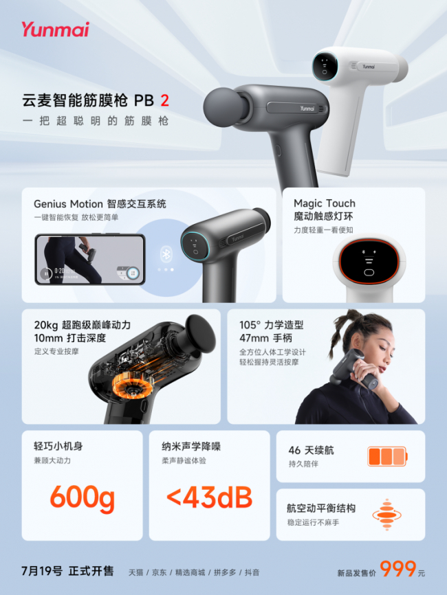 7月19日,云麦智能筋膜枪PB2重磅上市,售价999元。作为云麦推出的首款智能筋膜枪,云麦智能筋膜枪PB2不仅具备专业级的性能表现,还得益于前沿智能科技的赋能,可以为用户提供包含智能交互课程、智能按摩等功能在内的高效放松解决方案。无论是入门级健身人群,还是资深运动爱好者,都能在云麦智能筋膜枪PB2的助力下获得高效的放松体验,保持最佳状态,打造良好体态,让运动更简单。