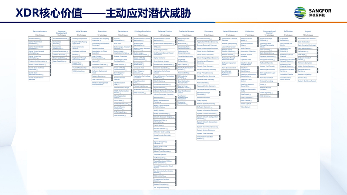 深信服SaaS XDR可覆盖ATT&CK 264项技战术,无论是低成本、破坏性小的自动化攻击,还是到高级潜伏、破坏性大的0day漏洞攻击,都无所遁形。