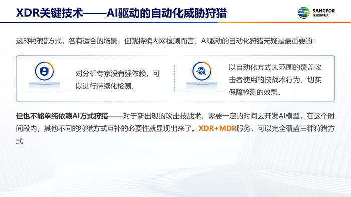 XDR需要发现各种具备高度绕过、逃避技巧的攻击,需要发现针对性极强的定向攻击,这就意味着XDR必须提供基于攻击技战术的行为检测能力——威胁狩猎。同时,考虑到狩猎专家的稀缺性,XDR不可能依赖以人为主的狩猎,而需要基于AI或者机器学习的方式,以多维检测形成合力,应对各种复杂场景下的攻击威胁。