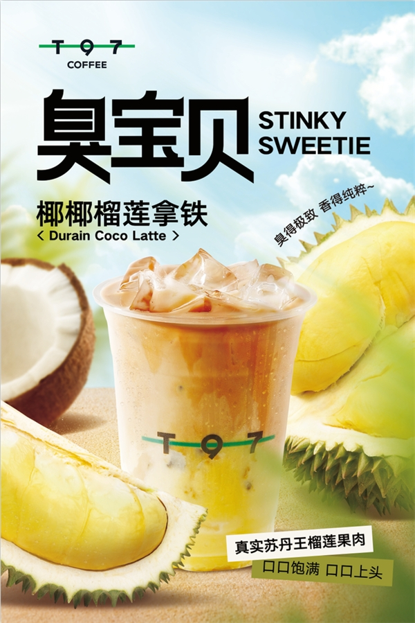 在最令人期待的新品发布环节,T97咖啡新品“臭宝贝”正式揭晓,榴莲和生椰搭配出独特的味觉体验,在现场收获了参会嘉宾们的一众好评。令人更惊喜的是,该款新品的名字和slogan来自有着“广告届营销鬼才”之称的金枪大叔,“找工作上boss直聘,跟老板谈”、“铂爵旅拍,想去哪拍,就去哪拍”等一系列脍炙人口的品牌slogan都是出自他手。这次他为T97打造的专属slogan“这杯臭宝贝,送给你的臭宝。”以简洁有力的语言与产品特点充分融合,也进一步了拉近品牌和消费者的距离。