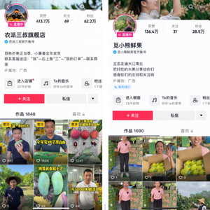 其中,一个账号是“农派三叔水果基地”是做了两年的官方账号,用来做旗舰店;另一个是新开设的“觅小熊鲜果”,是个性化IP的账号,官方和IP结合,也是岑参和同事们摸索的全域兴趣电商的方式之一。