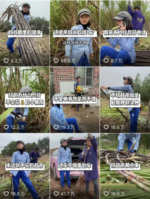 广西姑娘玉凤鸣以前在大城市打工,后来回到家乡,正好家里的甘蔗收获,在地里干活时,与母亲日常对话斗嘴的场景记录下来发到抖音上,不想一下子就火爆了,涨粉上百万。