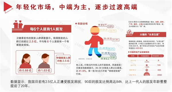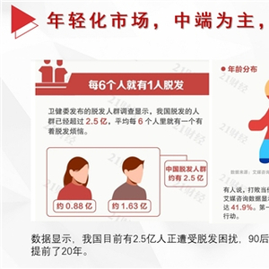 艾瑞咨询报告显示,美发市场2019已经达到3500亿,2022年将会突破4000亿!根据国内数据显示,我国目前有2.5亿人正遭受脱发困扰,90后的脱发比例高达84%,比上一代人的脱发年龄整整提前了20年。随着脱发人群增加,审美观念的变化,预计2022年养发头疗行业经济规模将超过600亿,“头等生意”越来越火爆!