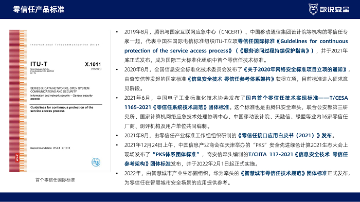 “一流厂商做标准”,据数说安全调研显示,腾讯安全在标准制定上最积极、成果最显著,牵头制定了全球首个零信任国际标准《服务访问过程持续保护指南》,也作为主力牵头国内团体标准的制定,并且非常注重生态的建设,与几十家安全公司形成零信任的产业协作关系。目前,零信任产业发展联盟会员单位已经发展到了58家,工作组制定的接口标准也完成了18个行业安全厂商对接。