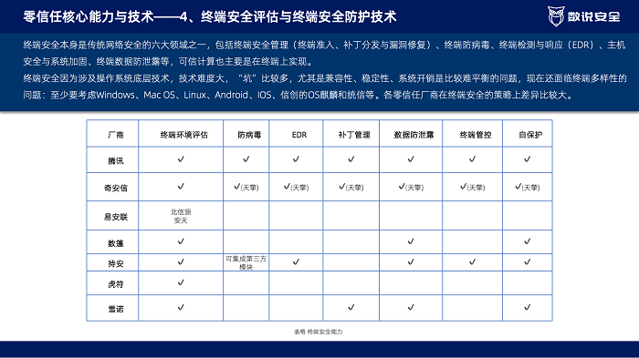 零信任目前主流的应用场景是远程接入的身份认证问题,因此终端安全也成为判断厂商技术综合实力的一项核心标准。终端安全涉及操作系统底层技术,面临技术难度大,兼容性、稳定性、系统开销的掣肘,现在还面临终端多样性的问题,各厂商在终端安全的策略厂差异比较大。